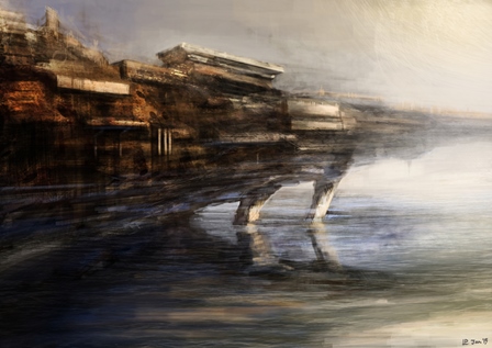 As well as using traditional media, many of these landscapes began as sketches drawn on his iphone whilst on the London Underground. These are then used as a base layer, painted over and textured using digital media.